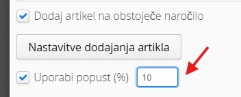 V primeru,da lahko uporabnik doda artikel na naročilo, ki še nima računa, mu lahko ponudite popust. Vrednost popusta vpišete v %. Funkcionalnost bo omogočila preračun cene v vrednosti popusta: