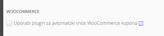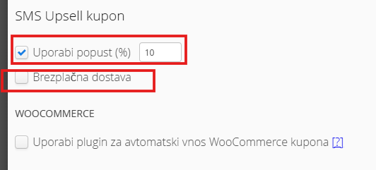 Izbirate lahko med vrednostjo popusta ali brezplačno dostavo.V primeru Shopify se kupon avtomatsko kreira in je veljaven kratek čas, nato se pobriše/deaktivira. V primeru WooComerce je potreben vklop: