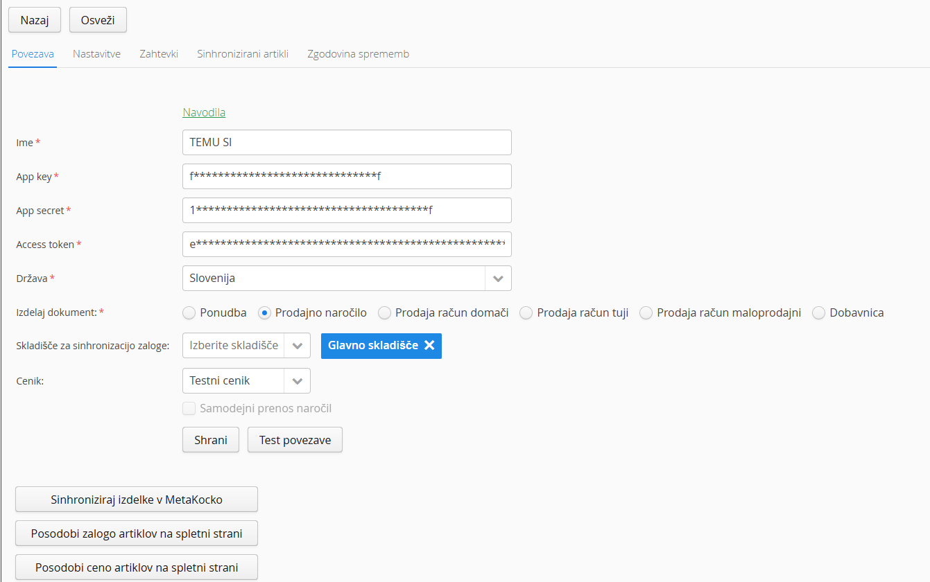 - App key, App secret, App token, Država spletne trgovine na Temu