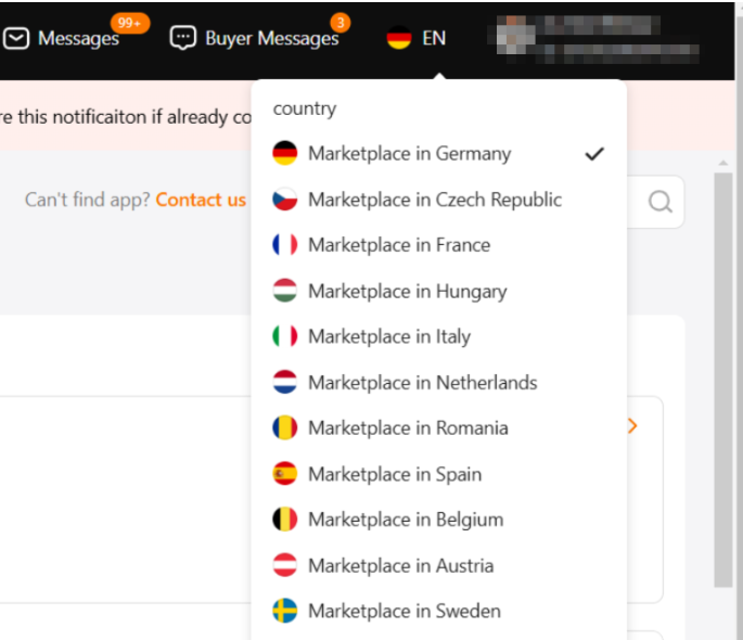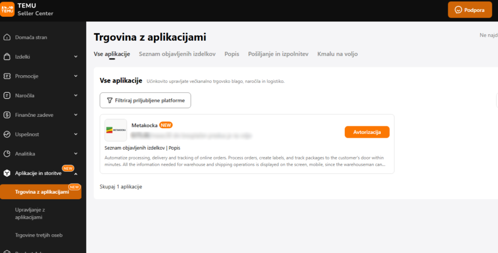 Za povezavo Metakocke z vašim Temu profilom boste morali v Temu, ustvariti povezavo s partnersko paltformo. Izberete Upravljaj z aplikacijami in izberete državo, katere trgovino želite povezati: