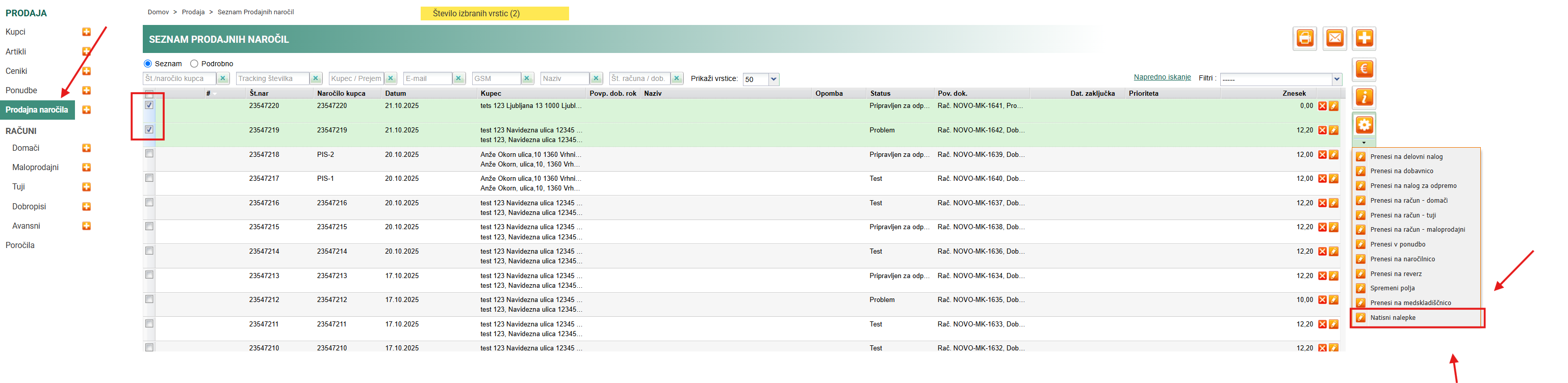 Izberete prodajna naročila za katera želite kreirati prenoznice izbranega kurirja, klik na ikono orodja in Natisni nalepke
