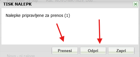 Po končanem tisku se izpiše dialog, uspešnosti kreiranja prevoznic dostavne službe, prevoznice prenesete v PDF ali s klikom na gumb odpri, odprete v novem zavihku.
