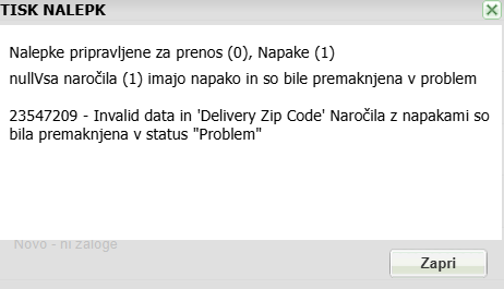 V primeru napake, kjer prevoznica ni bila uspešno kreirana se le ta izpiše, naročilo pa je prestavljeno v status Problem: