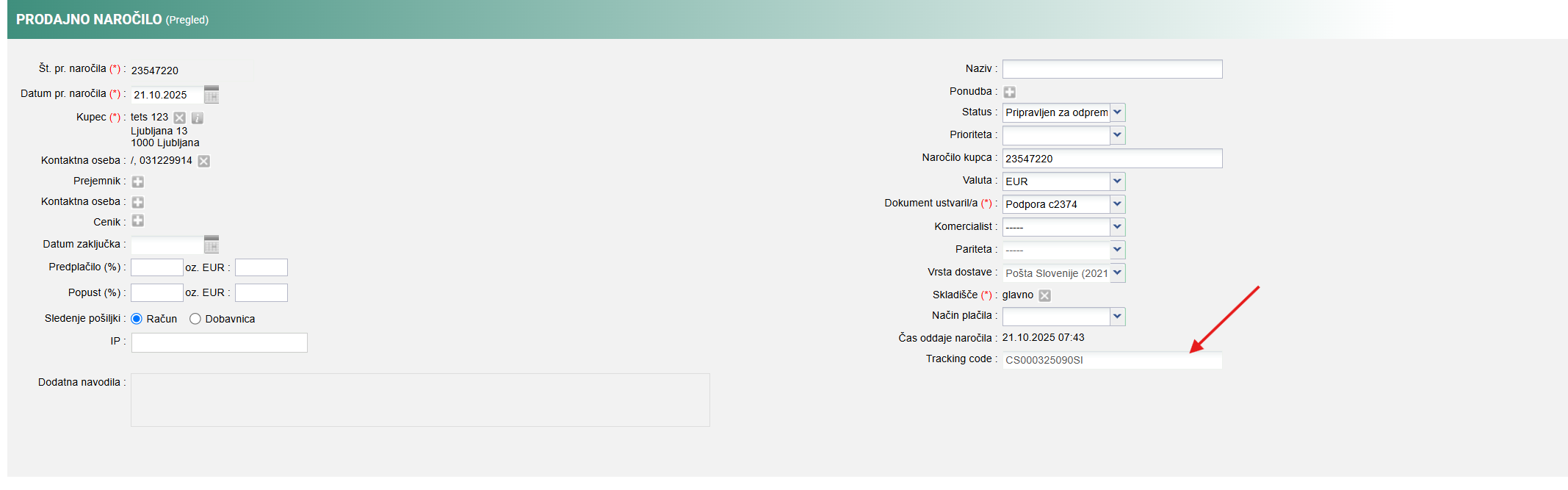 - V kolikor želite kreirati novo prevoznico, odstranite Tracking številko iz Prodajnega naročila, shrnaite, ter ponovite postopek.