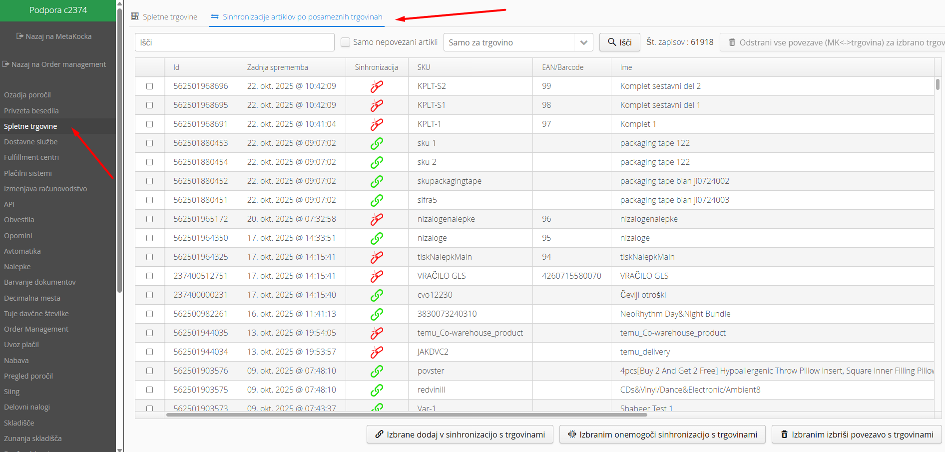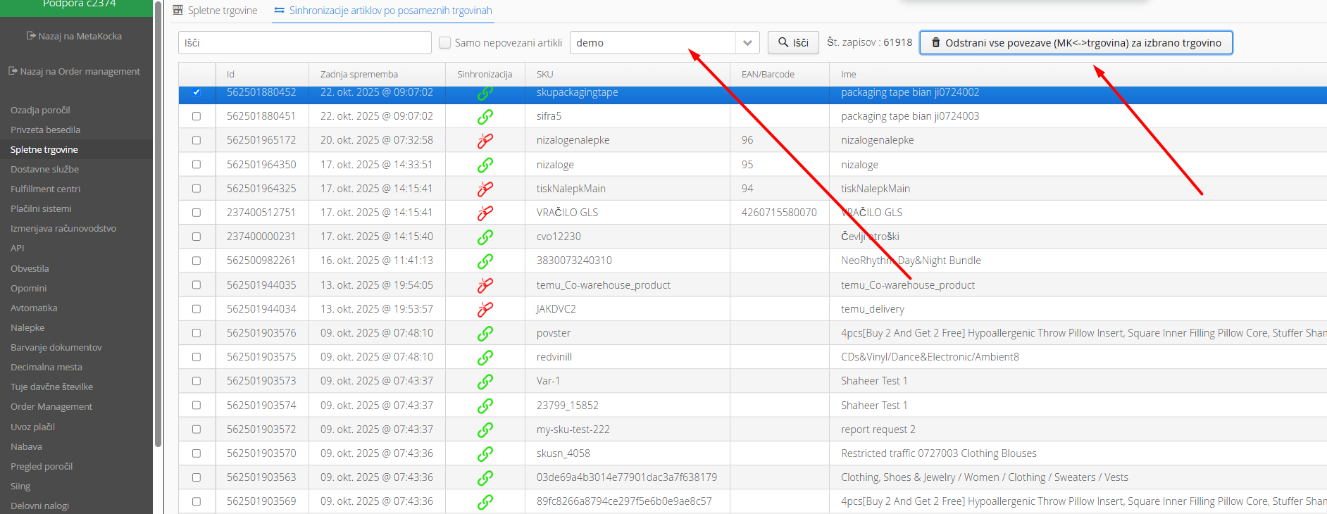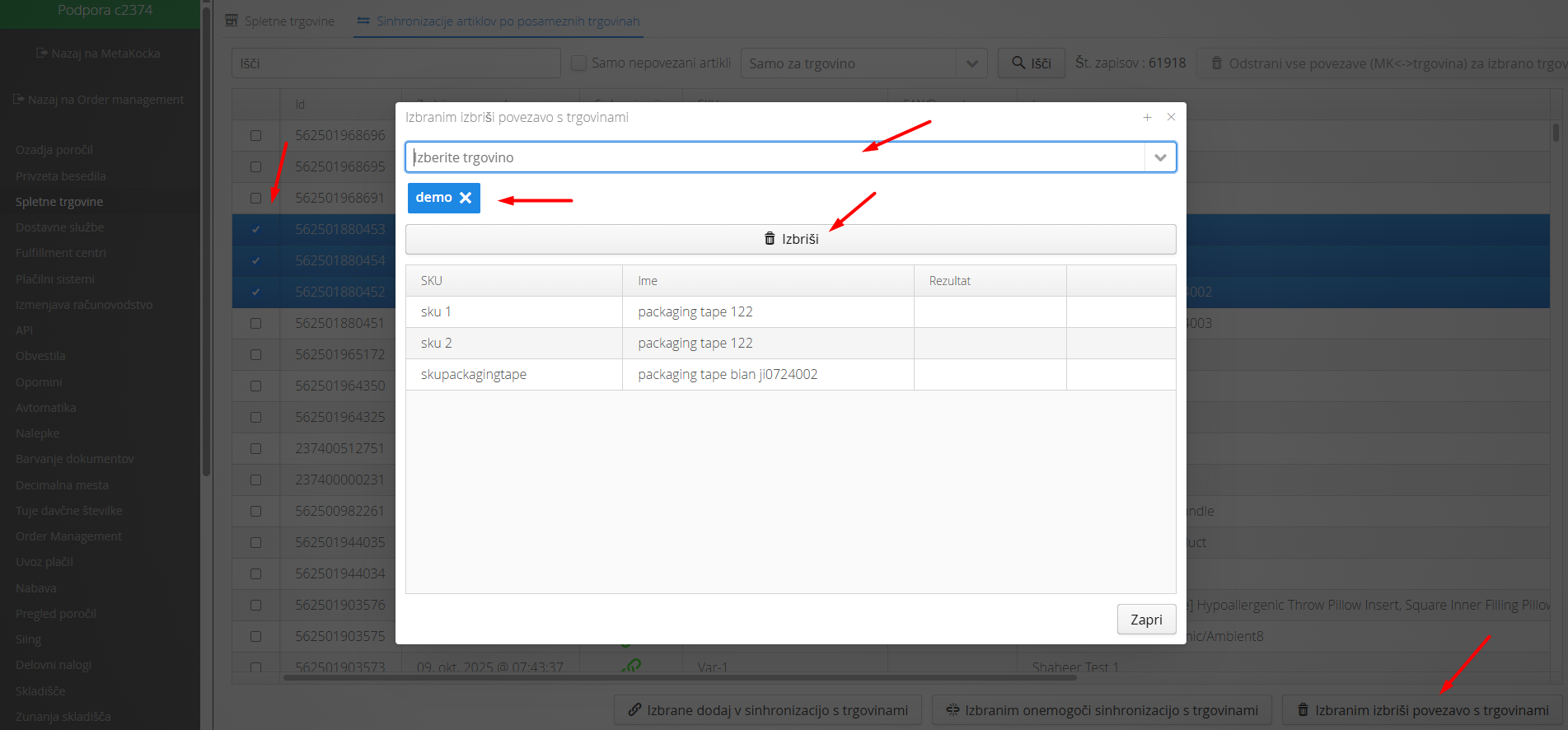 Artikle katerim želite izbrisati povezavo izberete, kliknete na "Izbranim izbriši povezavo s trgovinami", določite kateri trgovini želite izbrisati povezavo in kliknete na Izbriši.