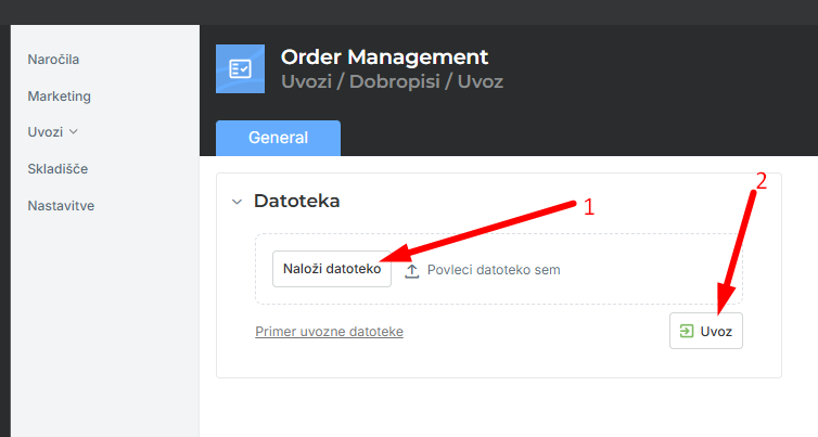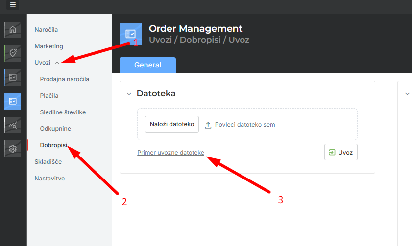 V Order Managementu pojdite v Uvozi – Dobropisi, kjer kliknete Primer uvozne datoteke.