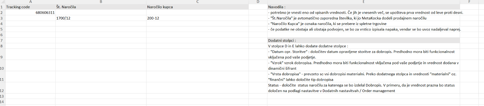 V datoteko, ki jo prejmete, prekopirate podatke iz datoteke dostavne službe. Na desni strani datoteke so zapisana navodila, katere podatke uporabite za uvoz. Dovolj je že en podatek – tracking koda, številka naročila ali naročilo kupca.
