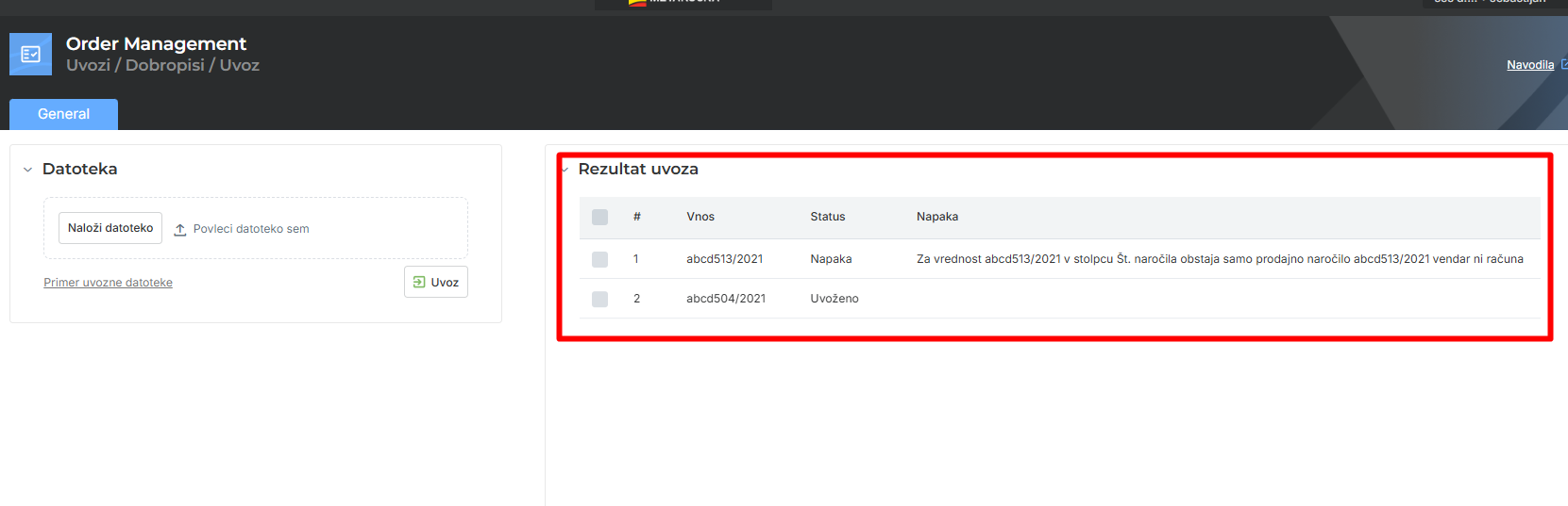 Po končanem uvozu se na desni strani izpišejo rezultati uvoza. V primeru napake se izpiše obvestilo, da je prišlo do napake.