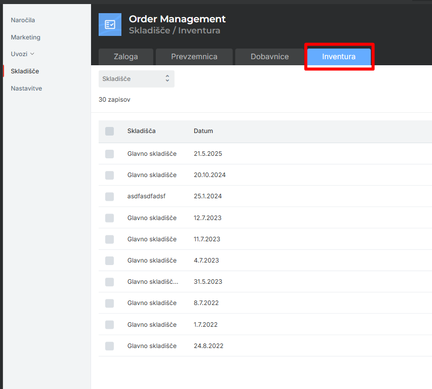 V zavihku Inventura imate pregled vseh ustvarjenih inventur. Ob kliku na posamezno inventuro se ta odpre, tako da lahko preverite, katere artikle vsebuje.