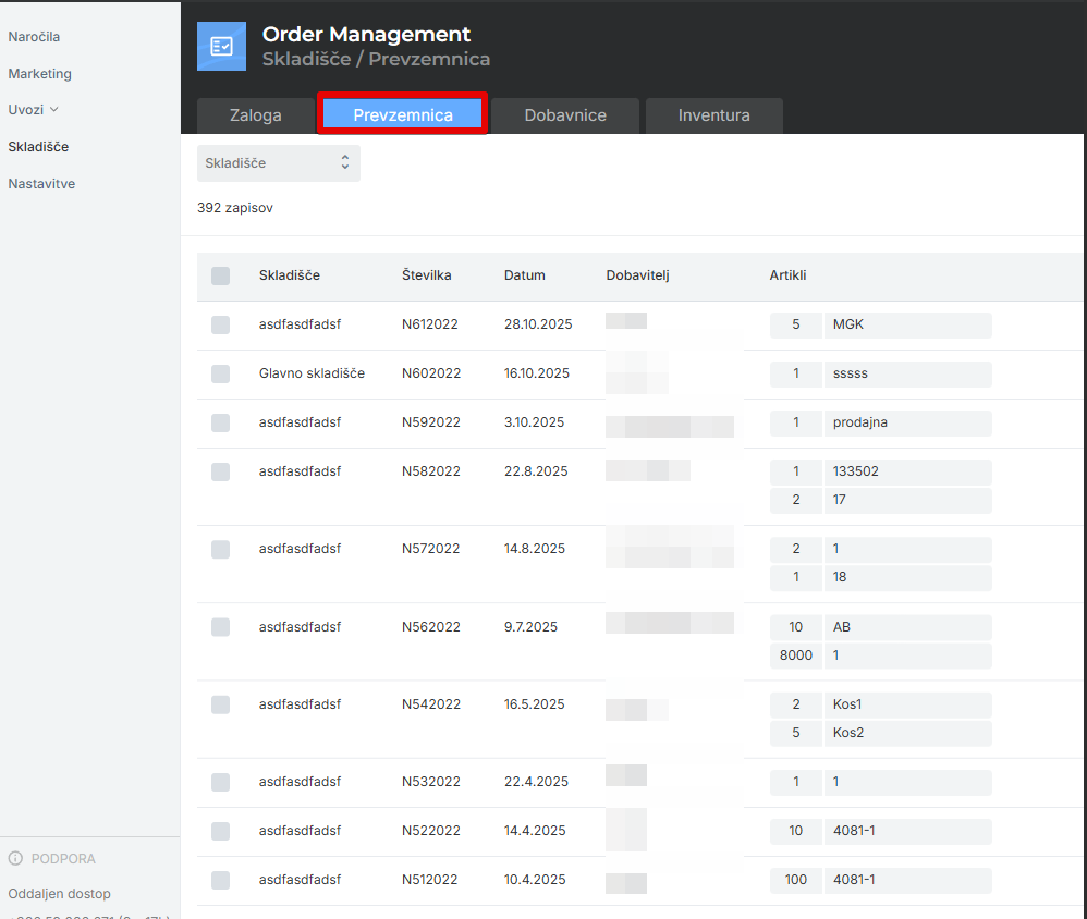V zavihku Prevzemnica lahko vidite vse prevzemnice, ki so bile ustvarjene, ter artikle, ki jih posamezna prevzemnica vsebuje.