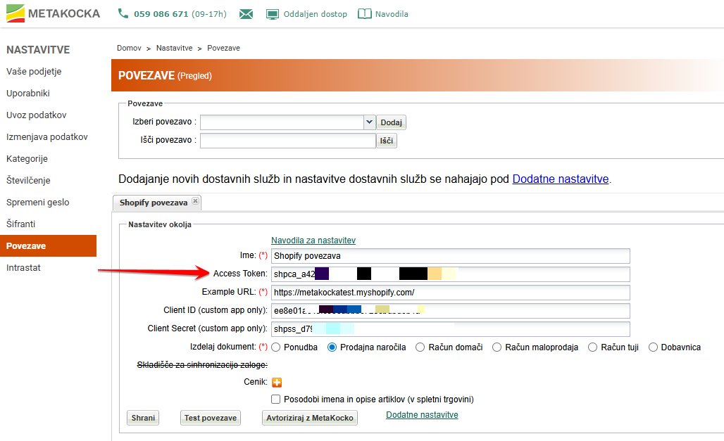 Če je polje polno pomeni, da ste uspešno vzpostavili povezavo med vašo Shopify trgovino in MetaKocko.