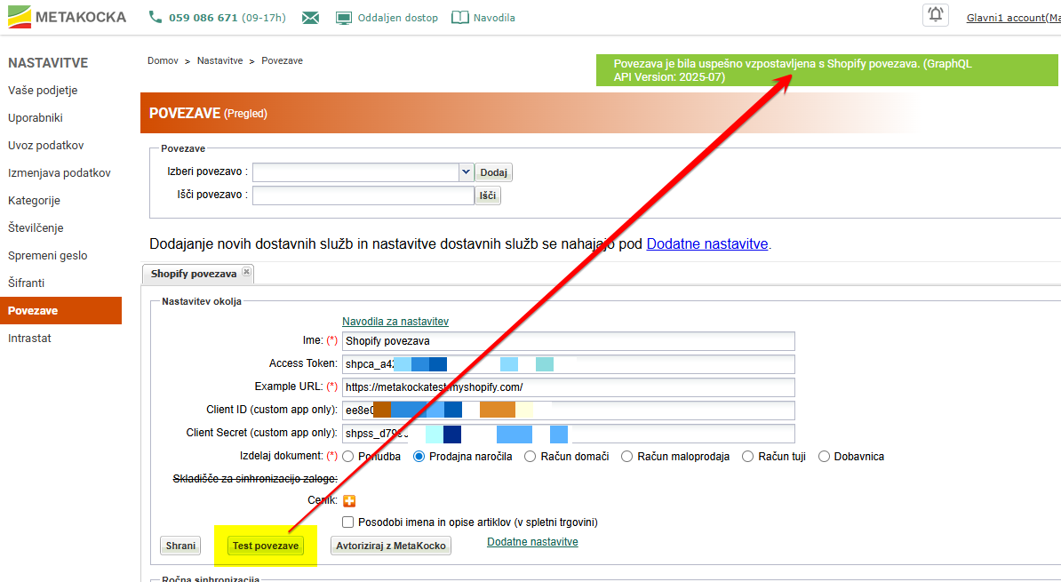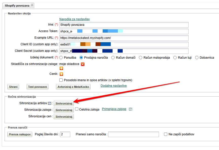 V Metakocki se sinhronizacija artiklov sproži v Nastavitvah povezave