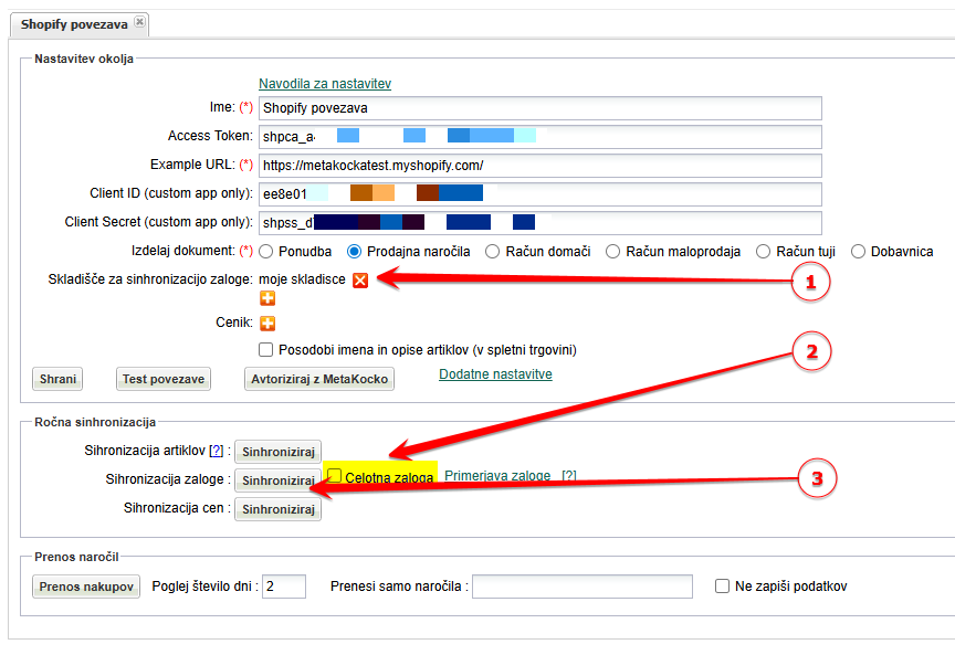 Sinhronizacija zaloge poteka enosmerno iz Metakocke v Shopify, sproži se v nastavitvah / povezave.