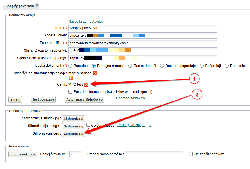 Operacije sinhronizacije cen iz MetaKocke v Shopify prenese bruto cene.
