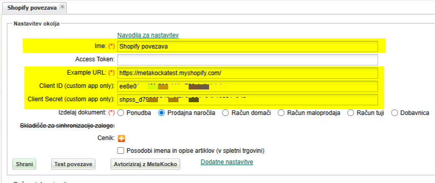 Omenjene nastavitve omogočajo MetaKocki ustrezne pravice za dostop do podatkov o naročilih/zalogi/artiklih, hkrati pa omogočajo preusmeritve, ki so potrebne za avtorizacijo med Shopify in MetaKocko.
