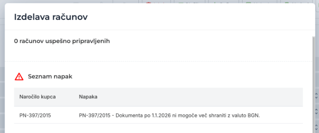 Onemogočeno shranjevanje dokumentov v BGN valuti