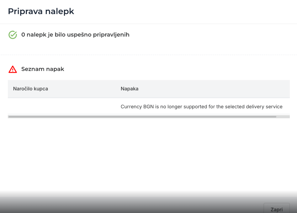 V kolikor ste v 2025 naredili naročilo in račun v BGN valuti, odpremo pa želite narediti v 2026, odprema ne bo mogoča zaradi valute BGN (napaka, se bo izpisala pri tisku prevoznic kot kaže sodaj slika). V tem primeru, je potrebno: